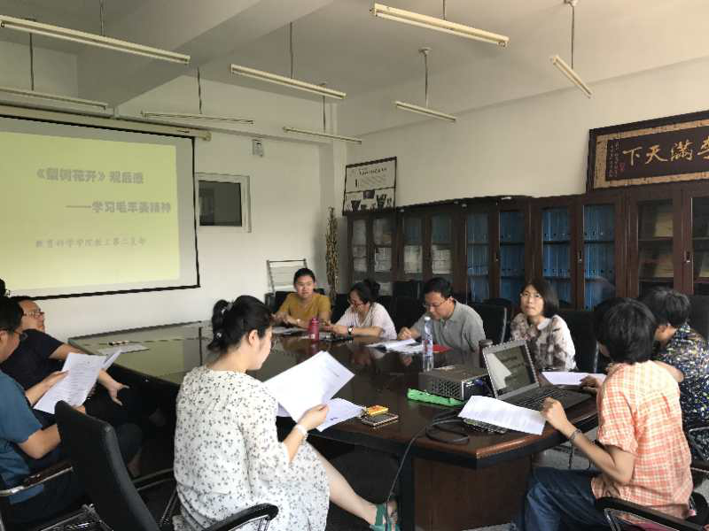 为积极响应“向毛丰美同志学习”的号召,推进沈阳师范大学ty8天游平台登录教工第二党支部“两学一做”学习教育的深入开展,2017年7月8日上午,教科院教工二支部在田家炳教育书院408会议室组织召开了主题为“学习习近平总书记系列重要讲话精神,观看《梨树花开》谈感受”学习活动。