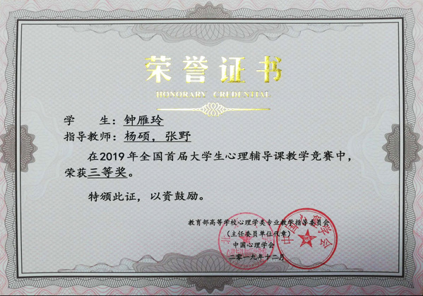 201912月,在教育部高等学校心理学类专业教学指导委员会和中国心理学会联合主办的“全国首届大学生心理辅导课教学竞赛”中,我院2016级应用心理学专业本科生钟雁玲同学的参赛作品《学会宽容 善待他人》在学院初评中突围,经过反复打磨、认真准备后,代表学校参赛。近日获悉,经过全国竞赛组委会专家匿名评审,最终荣获全国竞赛三等奖。