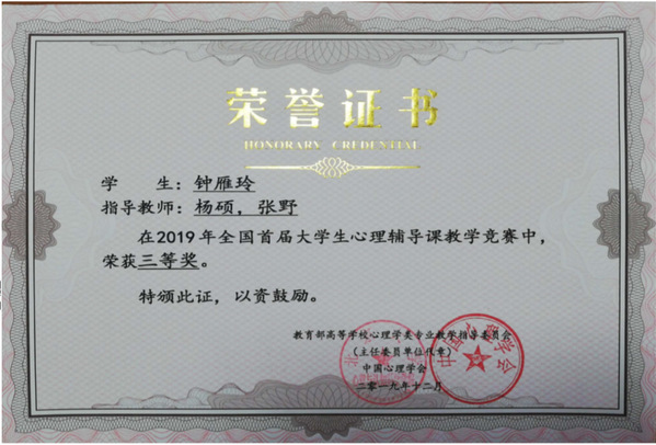 2020届钟雁玲同学获得全国首届大学生心理健康辅导课教学竞赛三等奖