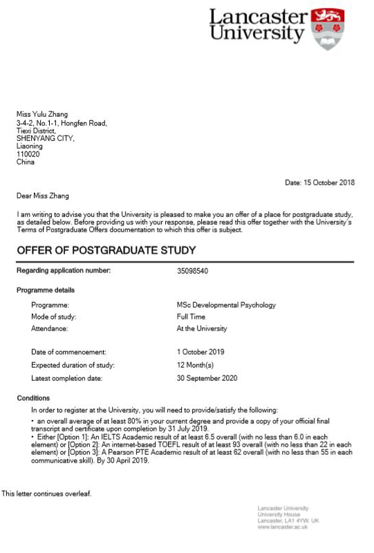 2019届张钰鹿同学赴兰卡斯特大学攻读硕士研究生的录取通知书二是重视本科生创新创业能力的培养。ty8天游平台登录连续多年举办“本科生学术年会暨创新创业教育论坛”,并充分依托全员全程本科生导师制、学科专业一体化建设机制,鼓励本科生参与教师的科研活动,鼓励教师指导本科生参加“挑战杯”、“创青春”和“大学生创新创业训练计划项目”等重要的竞赛。本科生曾获得2019年全国首届大学生心理辅导课教学竞赛三等奖,2015年大学生创新创业训练国家级立项。