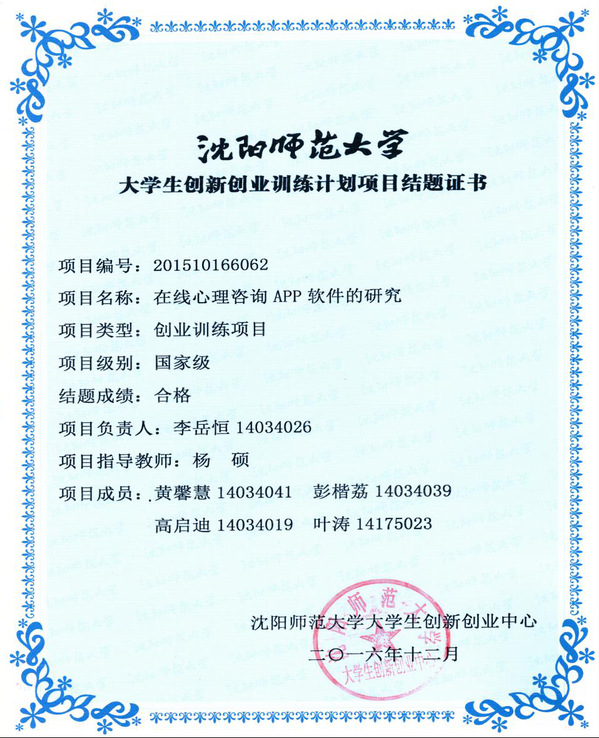 2018届李岳恒同学获得大学生创新创业训练计划国家级立项三是注重本科生综合素质能力培养。在夯实学生心理学基础知识基础上,专业尤其注重在教学实践过程中不断强化所有学生的综合实践能力,通过小学期、专业见习与实习、心理咨询师实操训练等途径不断提升学生的专业实践技能。本专业考研率和高质量就业率位居学校前列,一批毕业生成长为中小学心理健康教师、人力资源管理、教育及企业行政管理、心理学研究与应用等相关领域的卓越人才。