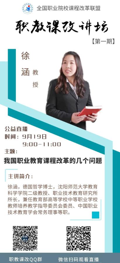 2020年9月19日上午9:00-11:00,由全国职业院校课程改革联盟主办的职教课改讲坛第一期在腾讯会议客户端云开讲,ty8天游平台登录徐涵教授应邀担任本期论坛主讲人,其学术报告的题目是《我国职业教育课程改革的几个问题》。