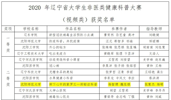 我院教师张慧杰、杨硕老师指导的2018级应用心理学专业本科生杨智博和魏佳琪的《种下心中的紫罗兰—抑郁症科普》荣获视频类二等奖;杨硕老师指导的2019级应用心理学专业本科生邱涂雯的《2020年沈阳师范大学非医类健康科普设计大赛校内选拔赛》获得科普文章类二等奖。