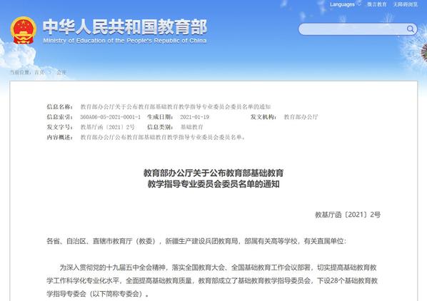 近日,教育部办公厅发布了《关于公布教育部基础教育教学指导专业委员会委员名单的通知》(教基厅函〔2021〕2号),我院张野教授被聘为心理健康教育指导专委会委员。