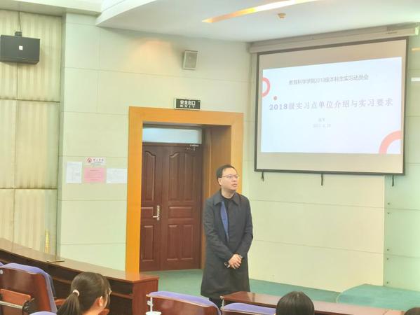 副院长高军向同学们介绍实习点与实习要求随后,实习指导教师代表逐一发表了对2018级同学实习的期望和寄语。教育学系副主任刘振宇老师从责任、人际关系和处理矛盾的方面向同学们作出动员。他期望同学们能够注意个人的责任心,应对好实习之中的人际关系,学会处理实习之中遇到的矛盾。他也向同学们转达了副书记郑欣的嘱托,并预祝同学们实习顺利。