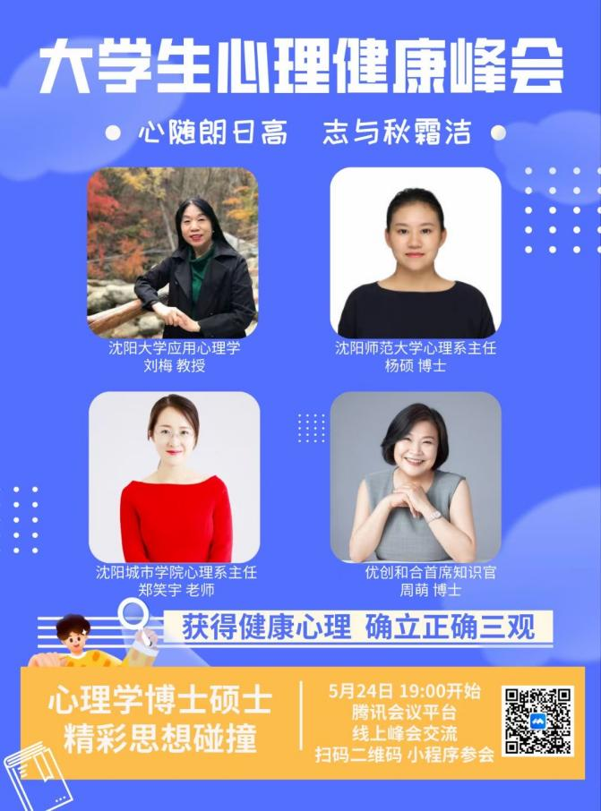 为进一步提高大学生的心理健康水平,2021524日晚7心随朗日高志与秋霜结——5.25大学生心理健康峰会在腾讯会议平台上如期举行沈阳师范大学杨硕老师沈阳大学刘梅老师沈阳城市学院郑笑宇老师沈阳优创和合心理服务机构周萌老师还有来自三所高校的2020级、2019级和2018级的心理学、教育学专业的近200名大学生共同参与本次活动