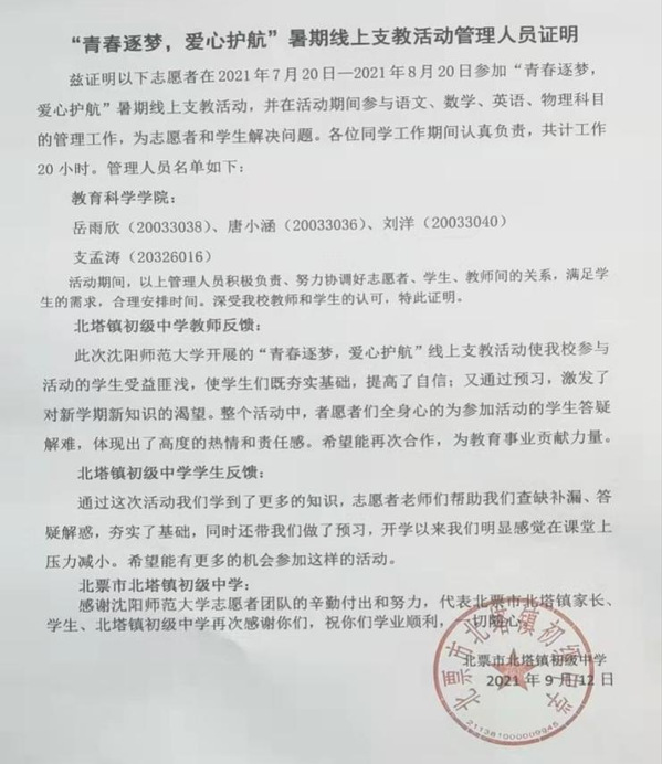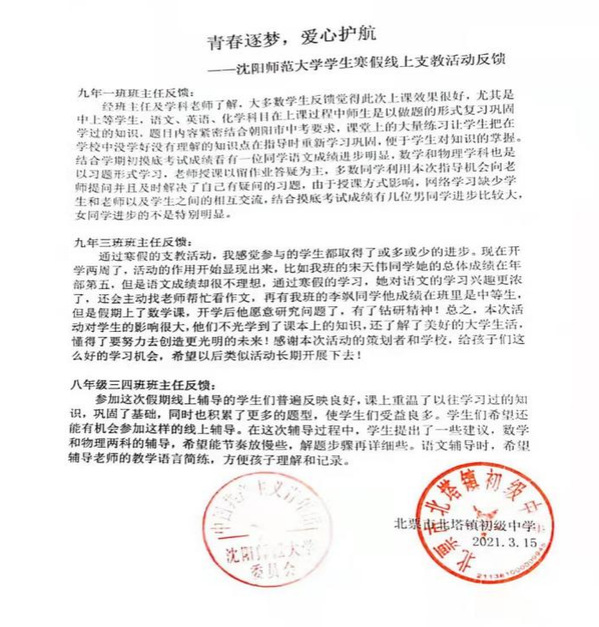 北塔初级中学位于辽宁省北票市北塔镇,师资力量薄弱,教育资源落后。为支援该地区的教育建设,锻炼沈师学子的实战教学能力,弘扬我校之教学风尚,ty8天游平台登录研究生和本科生积极策划和进行“青春逐梦 爱心护航线上支教活动。此次线上支教活动共分为2021年1-2月的寒假支教、2021年7-8月的暑假支教两个阶段。