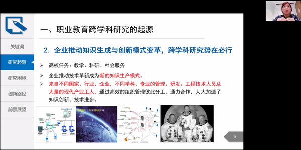 华南师范大学职业教育学院陈利敏博士做了《职业教育跨学科研究:源起、困境与创新路径》的报告,指出职业教育跨学科研究的创新路径是研究主体与研究方法要“多元”、以问题为导向搭建职业教育跨学科研究平台,放眼世界,立足中国特色,开展职业教育跨学科研究,高校通过改革创新推动开展职业教育跨学科研究。