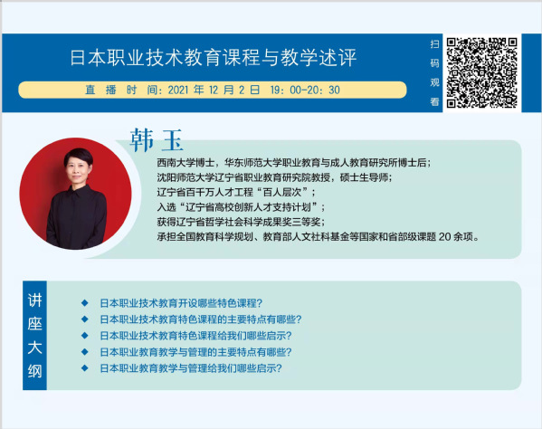 2021年12月2日19:00-20:30,沈阳师范大学、辽宁省职业教育研究院韩玉教授应北京师范大学出版社的邀请,参加了职教国际化视野系列直播,携新书《日本职业技术教育研究》与线上观众相聚直播间,韩玉教授分享的主题是:日本职业技术教育课程与教学述评。
