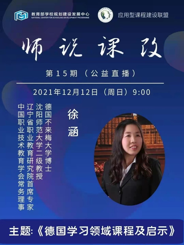 2021年12月12日上午9:00,应教育部学校规划建设发展中心、应用型课程建设联盟的邀请,沈阳师范大学辽宁省职业教育研究院徐涵教授应邀做客第15期师说课改公益讲坛,作题为《德国学习领域课程及启示》的学术报告。
