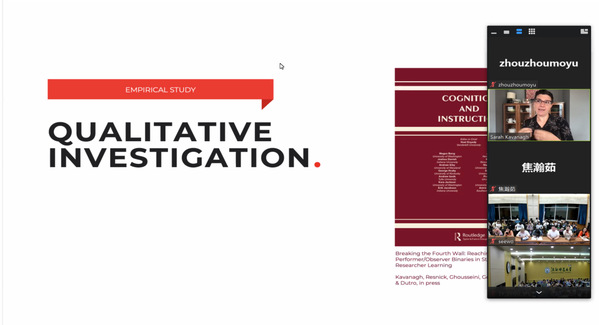在约一个半小时的时间内,在Sarah Kavanagh教授的指引下,同学们对打破教师学习设计的第四堵墙有了一定的了解和认识。报告结束后,线上及现场的师生通过网络提问链接及现场提问与教授进行了积极互动,教授与同学们就多个问题进行了交流,如“学习到底是什么?”,“技术在现代教育体系中扮演什么角色?”,“城乡差异下,如何确保教育公平?”,“教师如何调整课程设计和教学策略以适应学生之间的对话”,“在实践中,如何针对不同学生群体、不同教学情境的需求,做出适合的设计”等问题。