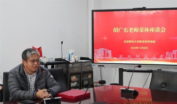 胡广东老师在发言中,分享了自己在教科院三十年的工作体会及感悟,言语中饱含着对工作的热爱和对同事的深厚情谊,同时表达了对学院的感谢,并对学院发展给予了真挚祝福。随后,朴雪涛院长代表学院为胡老师颁发了荣休纪念品。