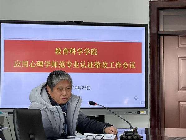 高军副院长首先强调了持续改进的重要意义,指出持续改进是师范类专业认证工作的重要理念和基本要求,也是师范类专业认证工作的价值体现,对于提高专业的人才培养质量至关重要,学院、专业和任课教师在日常教学工作中坚持师范专业认证理念,持续改进,将师范专业认证理念内化为师生的信念,外化为教与学的行为。随后,他对应用心理学专业认证整改中涉及的本年度报备材料做了详细的讲解,强调务必按要求高质量地做好整改工作方案、面向产出要求修订的制度文件和课程目标达成评价材料、持续改进证据清单。最后,他对本年度应用心理学专业报备工作做了具体的安排,并要求教育学专业也要按照专业认证的理念和要求做好日常的教学和管理工作。