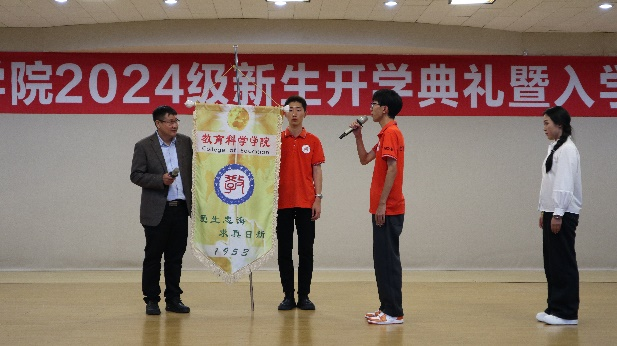 高军副院长为新生代表颁发院徽,院徽上印着我们的院训“爱生忠诲,求真日新”,同时院徽也承载着学院的历史、使命、价值观和精神风貌,希望可以激励新同学们为学院的发展和社会的进步而努力奋斗。
